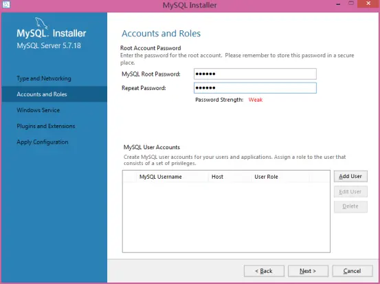 在Root Account Password设置数据库root账号的密码,我们需要牢记这个密码,然后点击“Next”