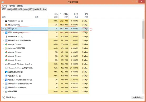 - 提示启动成功后我们便可以在任务管理器的进程里看到“mysqld.exe”的进程了。