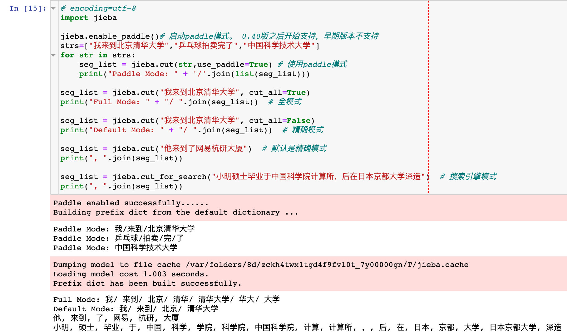 seg_list = jieba.cut(strings[i].strip(), cut_all=False) # seg_list只是一个generator生成器:<class 'generator'> ;用list(seg_list)) # 用list方法展开
