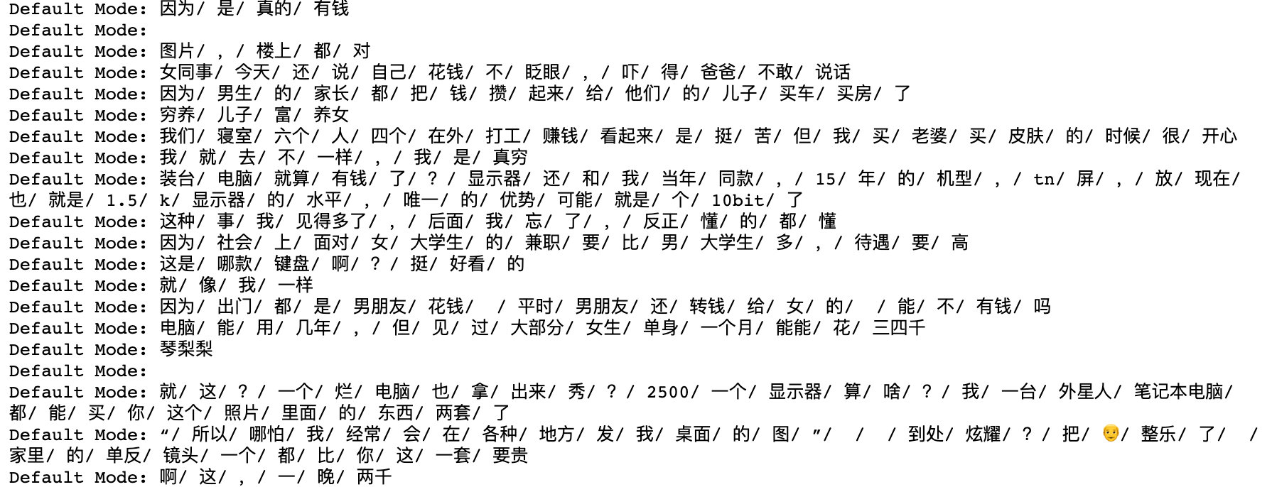 print(("Default Mode: " + "/ ".join(seg_list))) # 用list方法展开