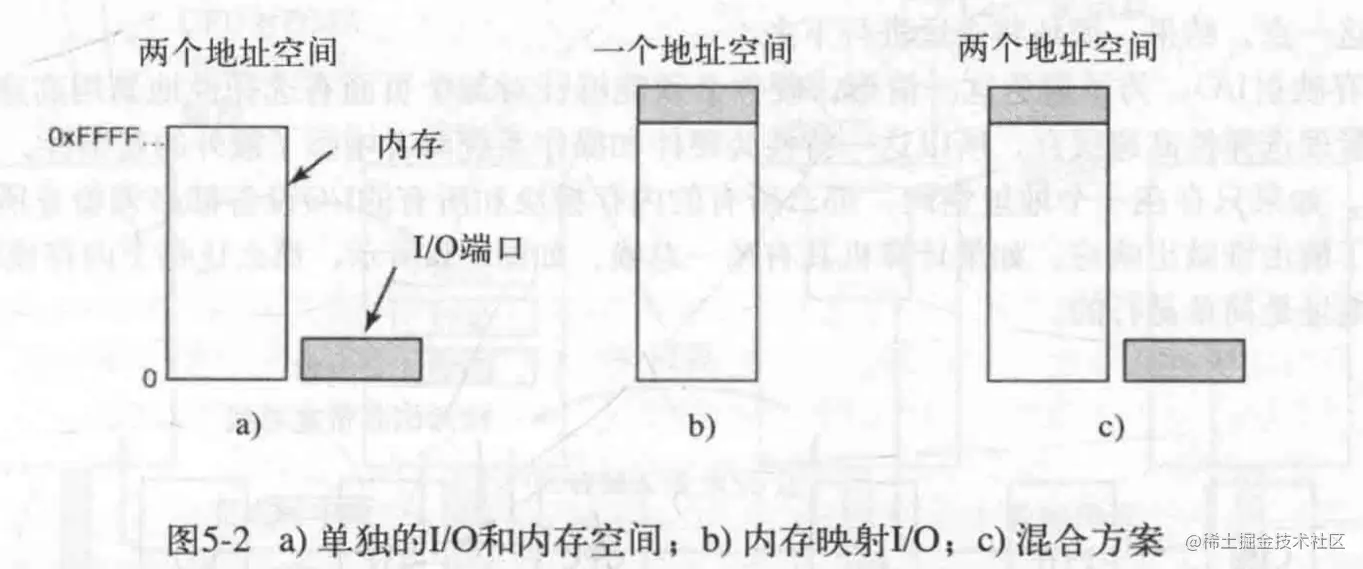 第二种方法又称为内存映射I/O。每个设控寄存器被分配一个唯一的,不会被再次分配地内存空间。第三种是混合实现,这种方案具有内存映射I/O地数据缓冲区,同时设控寄存器也拥有自己的I/O端口。这也是x86架构使用的方法。