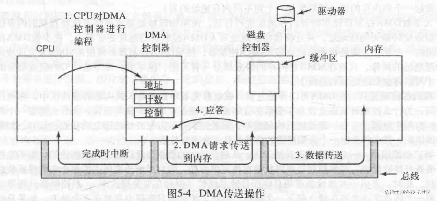 此时完成写入,磁盘发处应答信号(第四步),DMA收到,步增内存地址,步减字节计数器,若不为0,重复2-4步,当字节计数器为0时,DMA中断CPU,OS开始实际的工作。