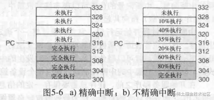 有些计算机是针对某些中断和陷阱是精确的,某些则是不精确中断,比方说,I/O处理时精确中断而除零异常则不是,因为重启进程没意义,除零本来就是错的;还有些计算机可以设置它的某个位,使它对于所有中断都是精确的,只不过对开销很大,因为需要实时记录指令日志并维护寄存器影子副本。