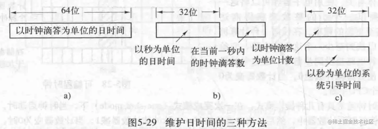 维护实际时间有三种方法,一种是用64为计数器累计时钟滴答数,第二种是以秒为单位,每次时钟滴答了一秒的长度就加1,最后一种记录开机时备份时钟的滴答数,并从此时开始累加,需要时间时,把备份时间加上累加时间就可以了。