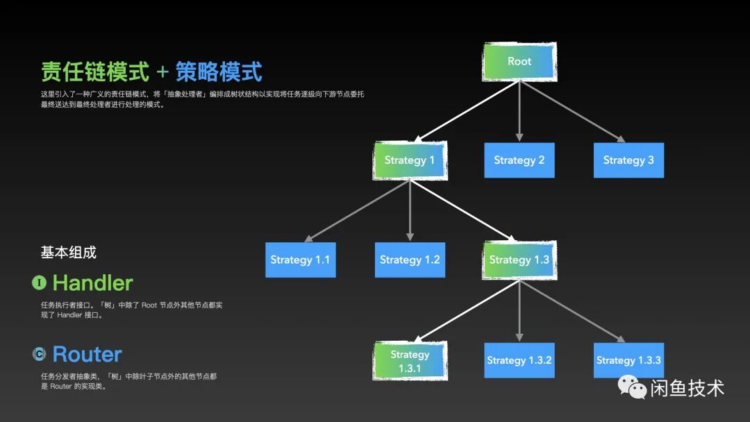 对于其他责任树中的中间层节点,都需要同时继承 Router 抽象类和实现 Handler 接口,在 R apply(T param); 方法中首先进行一定异常入参拦截,遵循 fail-fast 原则,避免将这一层可以拦截的错误传递到下一层,同时也要避免「越权」做非本层职责的拦截校验,避免产生耦合,为后面业务拓展挖坑。在拦截逻辑后直接调用本身 Router 的 publicR applyStrategy(T param) 方法路由给下游节点即可。