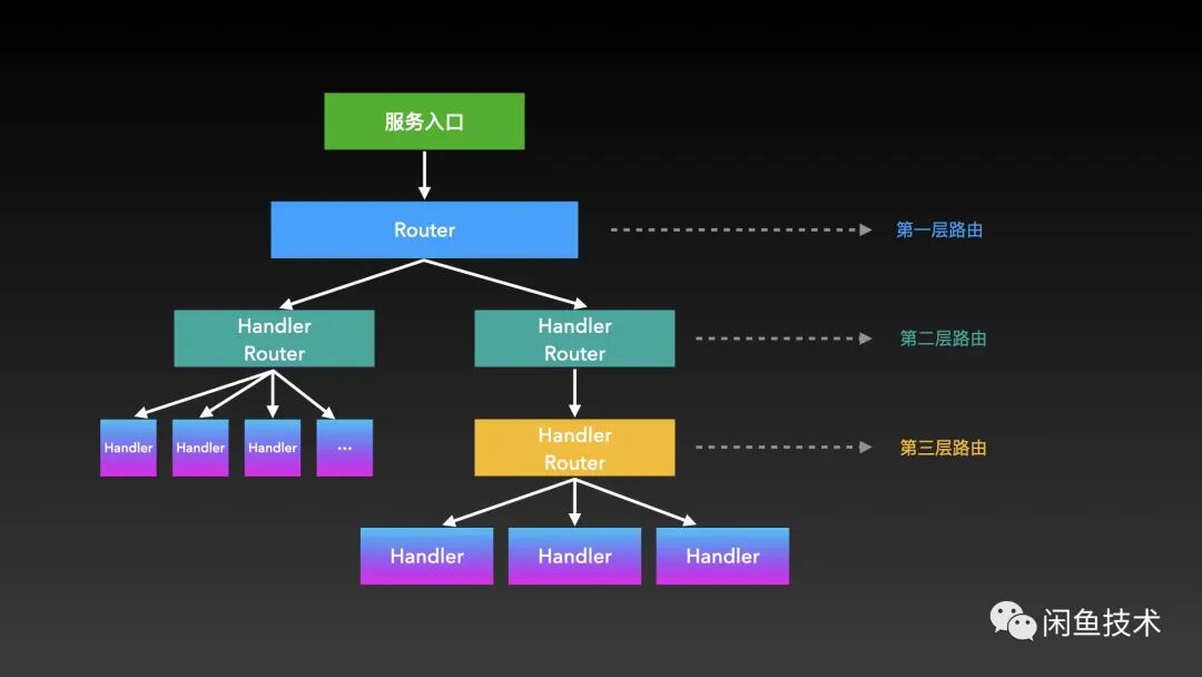除了根节点和叶子节点外的其他节点,都是上一层的 Handler,同时是下一层的 Router;