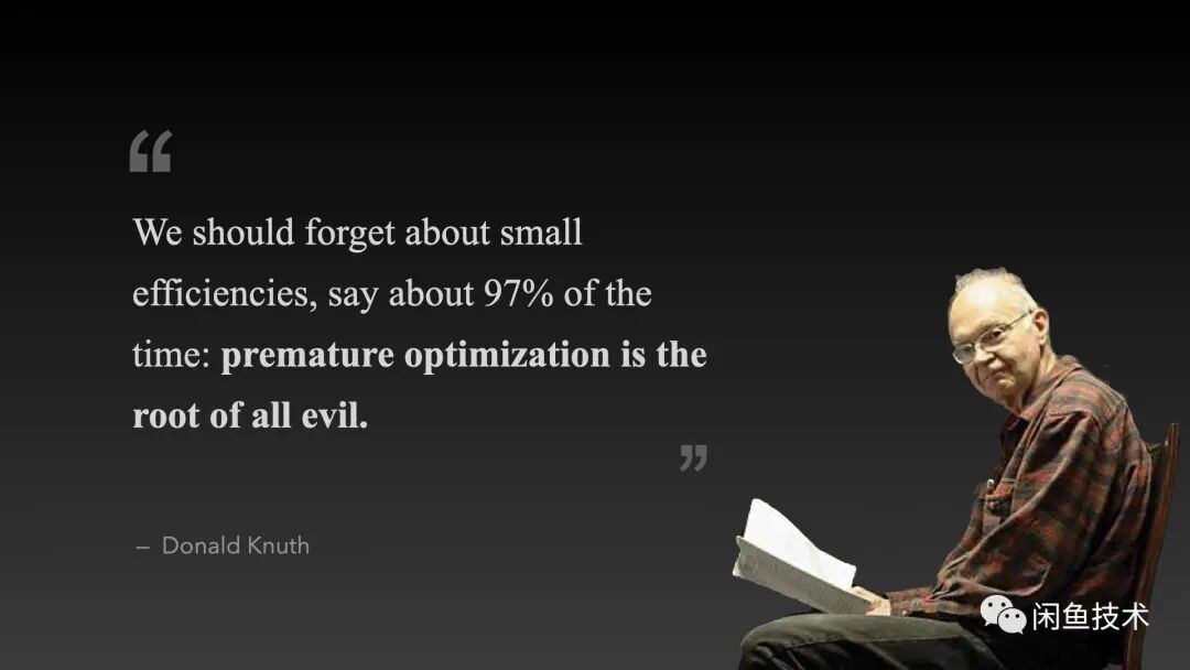 Knuth 这句话更偏重于反对奇技淫巧、细枝末节的性能优化,因为在「过早」的时候无法准确获知系统的瓶颈且局部的优化不仅不能带来收益,反而会造成更大的代价。他批评的恰恰是不着眼于整体架构的局部视角对系统的破坏,而架构设计正是需要从整体视角去做选择与权衡。因此将 Knuth 这句话直接推广到「架构设计」上并不妥当;