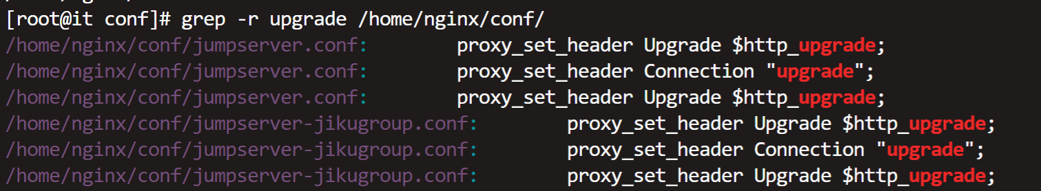 检查所有nginx服务器上所有的配置文件可以看到,只有jumpserver配置了WebSocket。是jumpserver存在客户端进程一直连接的情况导致的。 解决办法就是,在其他服务器上新增nginx,只迁移存放jumpserver一个应用的配置文件,因为jumpserver平时也不需要reload,长连接是否断开也无所谓了。