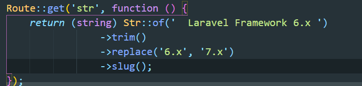 首先第一步将字符串 Laravel Framework 6.x 使用 Str::of() 方法进行包裹,之后我们就可以使用 Laravel 7 为我们提供的各种流畅的操作方法。