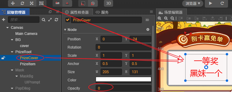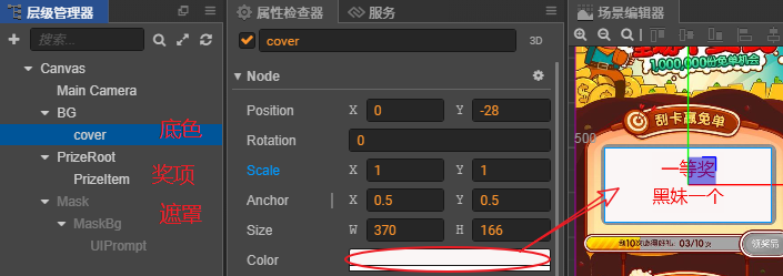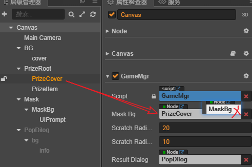 原理:类似于PS中的遮罩,或者沙画,比如你在玻璃上写了几个字,但是我在你玻璃上铺上了一层灰色的沙子(MaskBg),在沙子上撒了一点特仑苏,留下了“刮奖区”三个字。你想把下面的东西显示出来,只能拿到Mask节点上面的那把刷子,将沙子扫开。