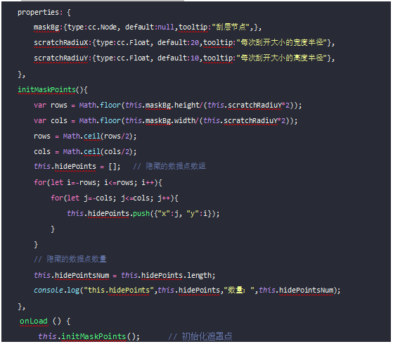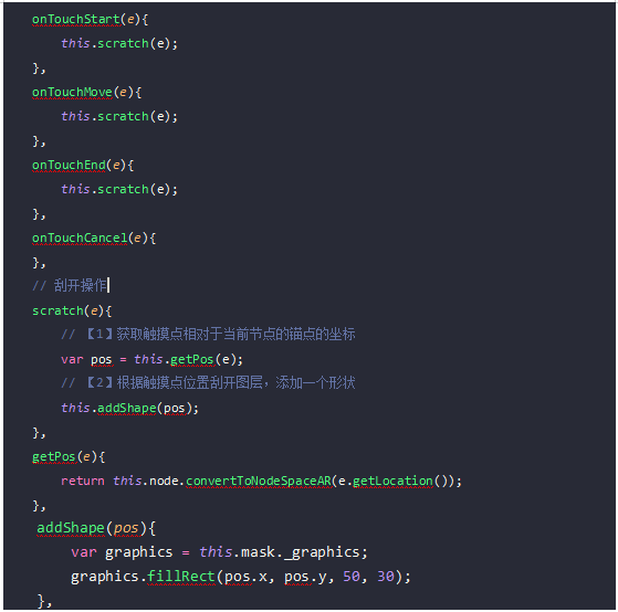 本方法是先根据接触点的大小在图片上排列一个点矩阵,每个点矩阵有一个检测范围且只能被检测一次,每次被检测刮开的数都会执行++操作,直到接触点等于目标点(刮开的范围可以自己设置)后,遮罩的图片消失,并执行回调函数。