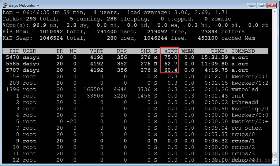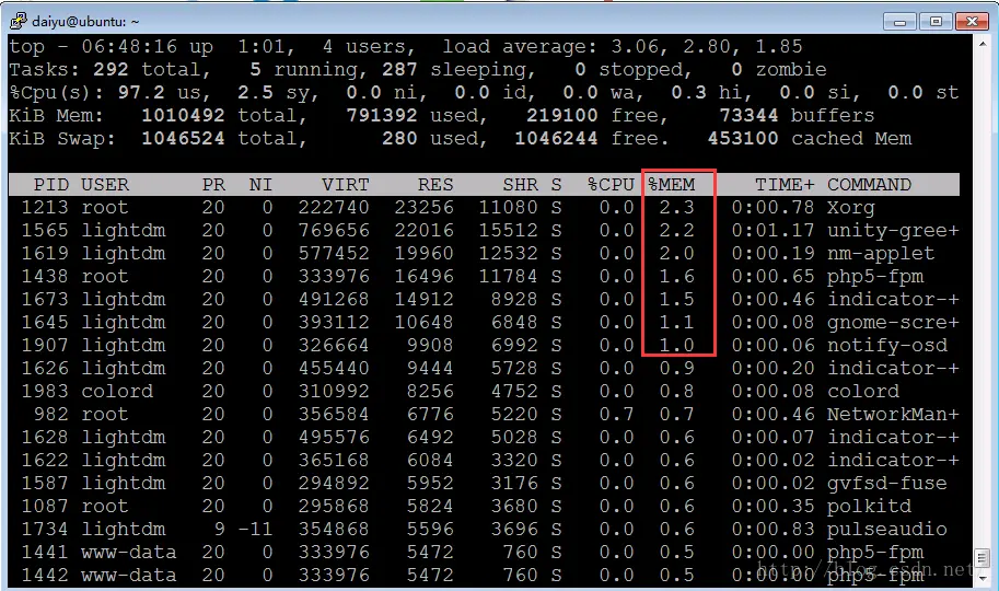 top命令按内存和cpu排序 晨少 2020-07-11 2,180 阅读1分钟 一、按进程的CPU使用率排序 运行top命令后,键入大写P。 有两种途径: a) 打开大写键盘的情况下,直接按P键 b) 未打开大写键盘的情况下,Shift+P键 二、按进程的内存使用率排序 运行top命令后,键入大写M。 有两种途径: a) 打开大写键盘的情况下,直接按M键 b) 未打开大写键盘的情况下,Shift+M键