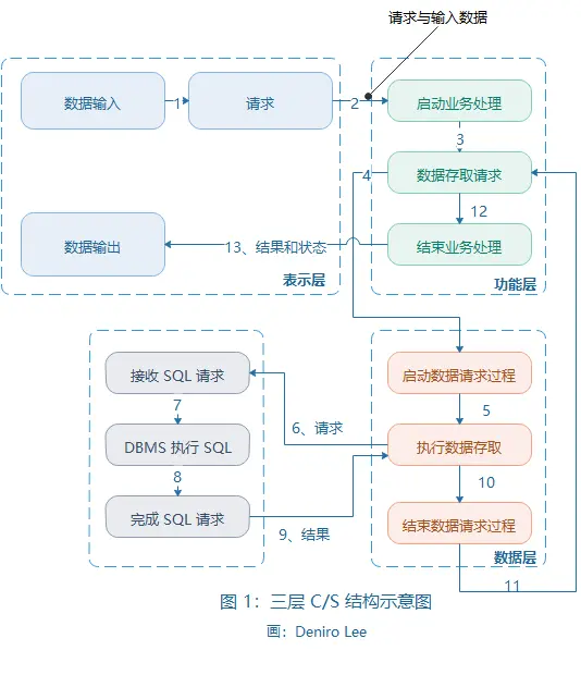 在三层 C / S 架构中,表示层负责处理用户的输入和向客户的输出(出于效率的考虑,它可能在向上传输用户的输入前进行合法性验证)。功能层负责建立数据库的连接,根据用户的请求生成访问数据库的 SQL 语句,并把结果返回给客户端。数据层负责实际的数据库存储和检索,响应功能层的数据处理请求,并将结果返回给功能层。