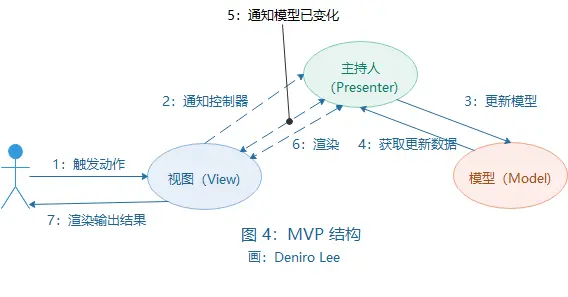 由于 Presenter 对 View 的依赖行为定义在接口I View 中,我们只需要一个实现了这个接口的 View 就能对 Presenter 进行测试。 MVP 的结构如图 4 所示。