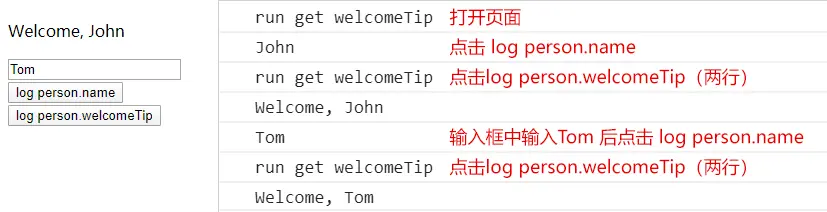 用法很简单,使用 observable 包裹原对象,使用 observer 包裹原组件,刷新页面后仿照改造前操作后发现,person 对象改变后,网页中的 “Welcome, John” 自动更新成了 ”Welcome, Tom”。