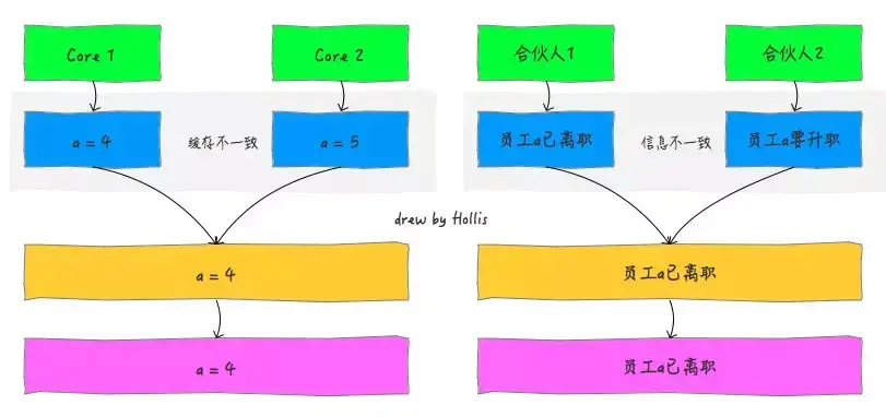 比如,合伙人1要辞退员工a,合伙人2要给员工a升职,升职后的话他再被辞退需要多个合伙人开会决议。两个合伙人分别把命令下发给了自己的管理人员。合伙人1命令下达后,管理人员a在辞退了员工后,他就知道这个员工被开除了。而合伙人2的管理人员2这时候在没得到消息之前,还认为员工a是在职的,他就欣然的接收了合伙人给他的升职a的命令。