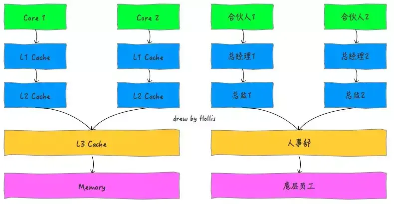 多核CPU就像一家公司是由多个合伙人共同创办的,那么,就需要给每个合伙人都设立一套供自己直接领导的高层管理人员,多个合伙人共享使用的是公司的底层员工。