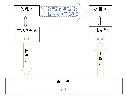 如上图所示,本地内存A和B有主内存中共享变量x的副本。假设初始时,这三个内存中的x值都为0。线程A在执行时,把更新后的x值(假设值为1)临时存放在自己的本地内存A中。当线程A和线程B需要通信时,线程A首先会把自己本地内存中修改后的x值刷新到主内存中,此时主内存中的x值变为了1。随后,线程B到主内存中去读取线程A更新后的x值,此时线程B的本地内存的x值也变为了1。