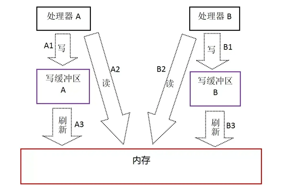 处理器 A 和 B 同时把共享变量写入在写缓冲区中(A1、B1),然后再从内存中读取另一个共享变量(A2、B2),最后才把自己写缓冲区中保存的脏数据刷新到内存中(A3、B3)。当以这种时序执行时,程序就可以得到 x = y = 0 的结果。
