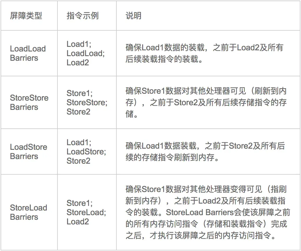 对于处理器重排序,JMM的处理器重排序规则会要求Java编译器在生成指令序列时,插入特定类型的内存屏障(memory barriers,intel称之为memory fence)指令,通过内存屏障指令来禁止特定类型的处理器重排序(不是所有的处理器重排序都要禁止)。