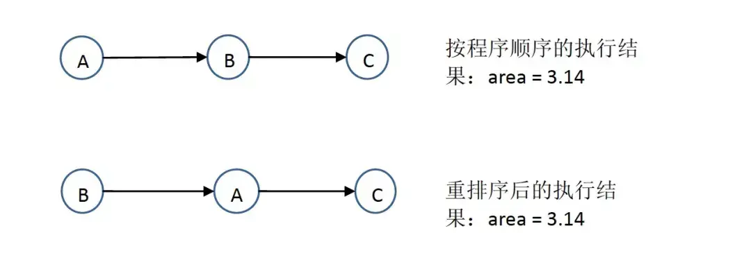 如上图所示,A 和 C 之间存在数据依赖关系,同时 B 和 C 之间也存在数据依赖关系。因此在最终执行的指令序列中,C 不能被重排序到 A 和 B 的前面(C 排到 A 和 B 的前面,程序的结果将会被改变)。但 A 和 B 之间没有数据依赖关系,编译器和处理器可以重排序 A 和 B 之间的执行顺序。下图是该程序的两种可能执行顺序: