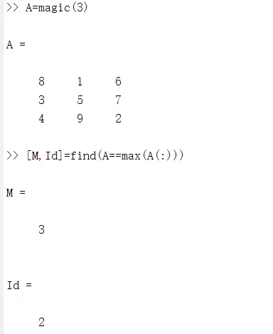 [M,Id]=find(A==max(A(:))) 返回A中最大值的位置,M接收为行,Id接收为列