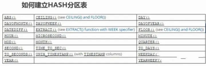 partition by list(字段)(partition p0 values in (x,x,x,x)...);- HASH 分区:基于用户定义的表达式的返回值来进行选择的分区,该表达式使用将要插入到表中的 这些行的列值进行计算。这个函数可以包含MySQL 中有效的、产生非负整数值的任何表达式。