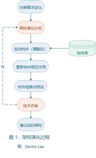 架构(系统)演化过程包含7个步骤,如图 1 所示。 (1)需求变动归类。首先,必须对用户需求的变化进行归类,使变化的需求与已有构件对应。对找不到对应构件的变动,也要做好标记,在后续工作中,将创建新的构件,以对应这部分变化的需求。 (2)制订架构演化计划。在改变原有结构之前,开发组织必须制订一个周密的架构演化计划,作为后续演化开发工作的指南。 (3)修改 、 增加或删除构件。在演化计划的基础上,开发人员可根据在第(1)步得到的需求变动的归类情况,决定是否修改或删除存在的构件 、 增加新构件。最后,对修改和增加的构件进行功能性测试。 (4)更新构件的相互作用。随着构件的增加 、 删除和修改,构件之间的控制流必须得到更新。 (5)构件组装与测试。通过组装支持工具把这些构件的实现体组装起来,完成整个软件系统的连接与合成,形成新的架构。然后,对组装后的系统整体功能和性能进行测试。 (6)技术评审。对以上步骤进行确认,进行技术评审。评审组装后的架构是否反映需求变动,符合用户需求。如果不符合,则需要在第(2)到第(6)步之间进行迭代。 (7)产生演化后的架构。在原来系统上所作的所有修改必须集成到原来的架构中,完 成一次演化过程。