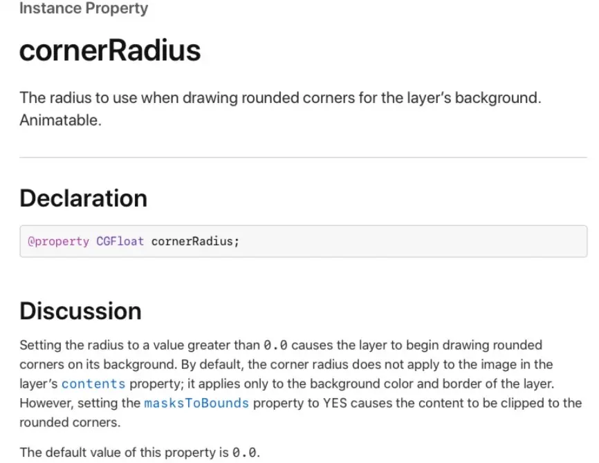 设置layer.cornerRadius只会设置backgroundColor和border的圆角。不会设置content的圆角;除非同时设置了layer。masksToBounds为true(对应view中的clipsToBounds属性)
