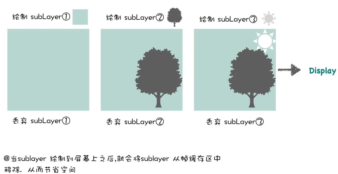 - 效率将会有优势:多次出现在屏幕上的效果可以提前渲染存储到离屏渲染缓冲区,达到复用目的(需要手动触发)