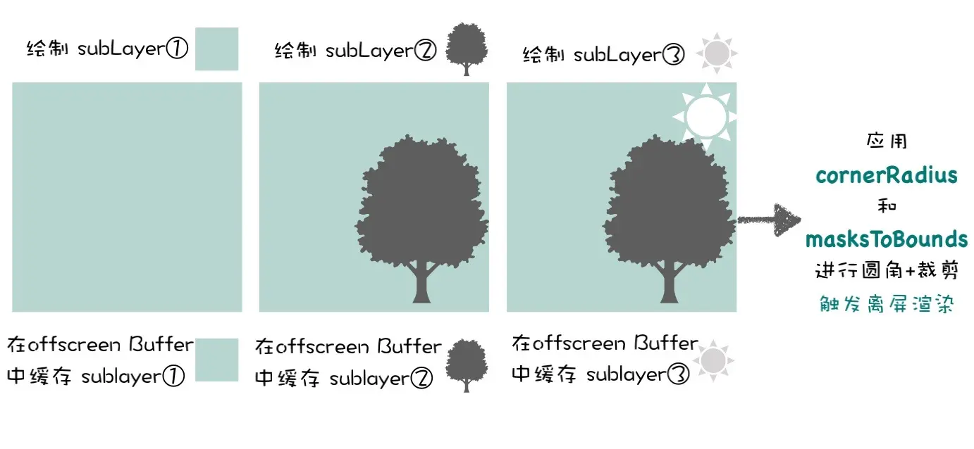 在屏幕上绘制出三个layer后,会将数据全部存放进离屏渲染缓冲区。如过对齐进行圆角+裁剪后触发离屏渲染: