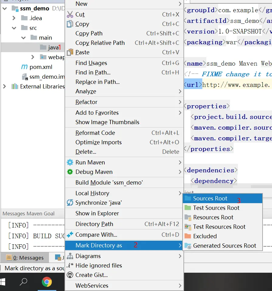 新建的“Java”目录是不会被识别成存放类的目录的,需要进行标记,才能被识别。具体操作为:鼠标右键选择main目录 -> New -> Mark Directory as -> Sources Root