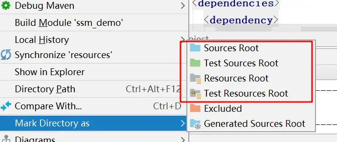 - ReSources Root :用于项目开发存储资源的文件夹,如配置文件,类路径(classpath)级别,一般代码中需要用到某些资源,比如resources被标记为ReSources Root,该目录有个applicationContext.xml,在代码中写路径的时候,就可以这样填:classpath:applicationContext.xml