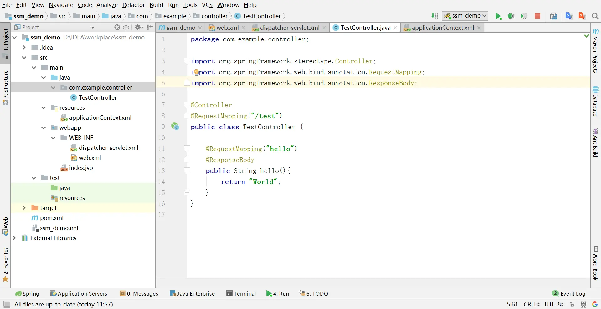 至此,我们已经完成了Spring+SpringMVC的整合,接下来我们先测试下有没有问题