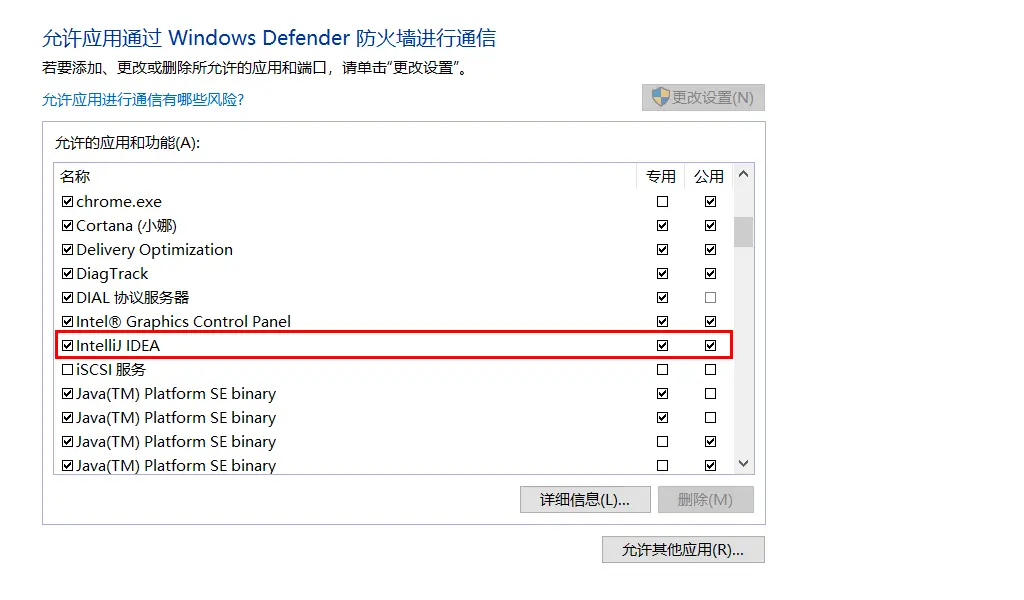 ①控制面板\系统和安全\Windows 防火墙\允许应用通过防火墙,把IDEA勾上