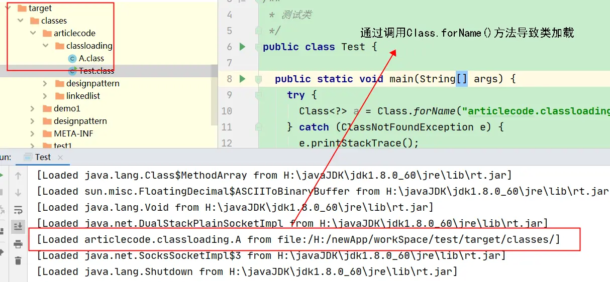 Class<?> a = Class.forName("articlecode.classloading.A");