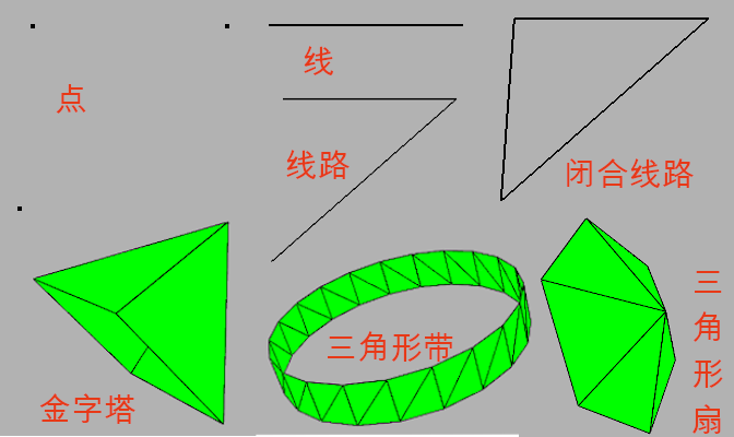 点、线、线路、闭合线路、金字塔、三角形带、三角形扇