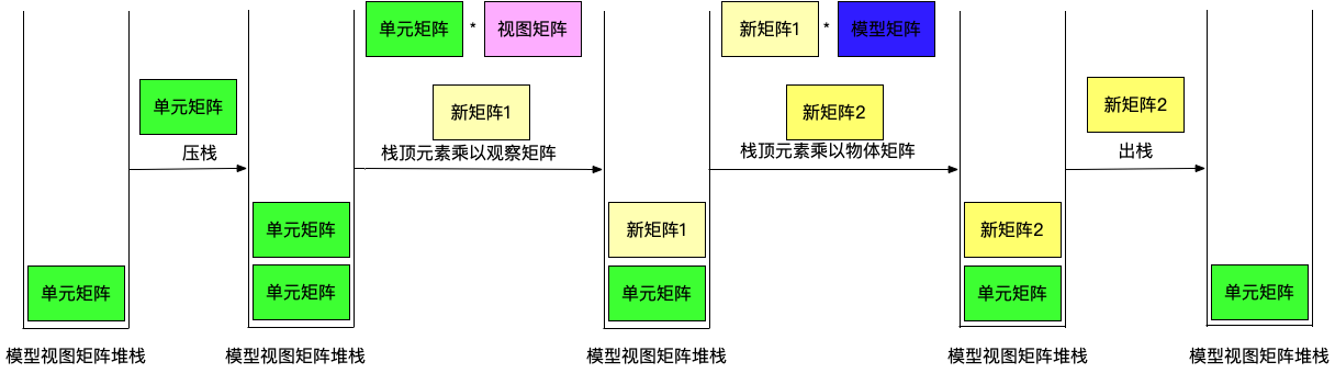 最后将单元矩阵载入到模型视图矩阵堆栈,此时图形还没有传入顶点,没有模型视图矩阵。modelViewMatrix 是一个矩阵堆栈对象。