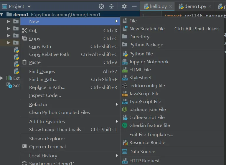 鼠标选中项目名,右键创建Python File,输入文件名字(比如demo1),回车就创建啦。
