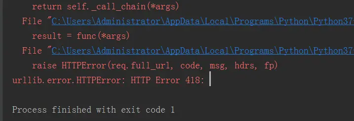 可以看到结果报错了,我们关注的就是下面的HTTP Error 418,这代表网站已经发现我们是爬虫了,不允许我们进行数据的爬取。所谓魔高一尺道高一丈,我们也有方法去应对418这种情况。