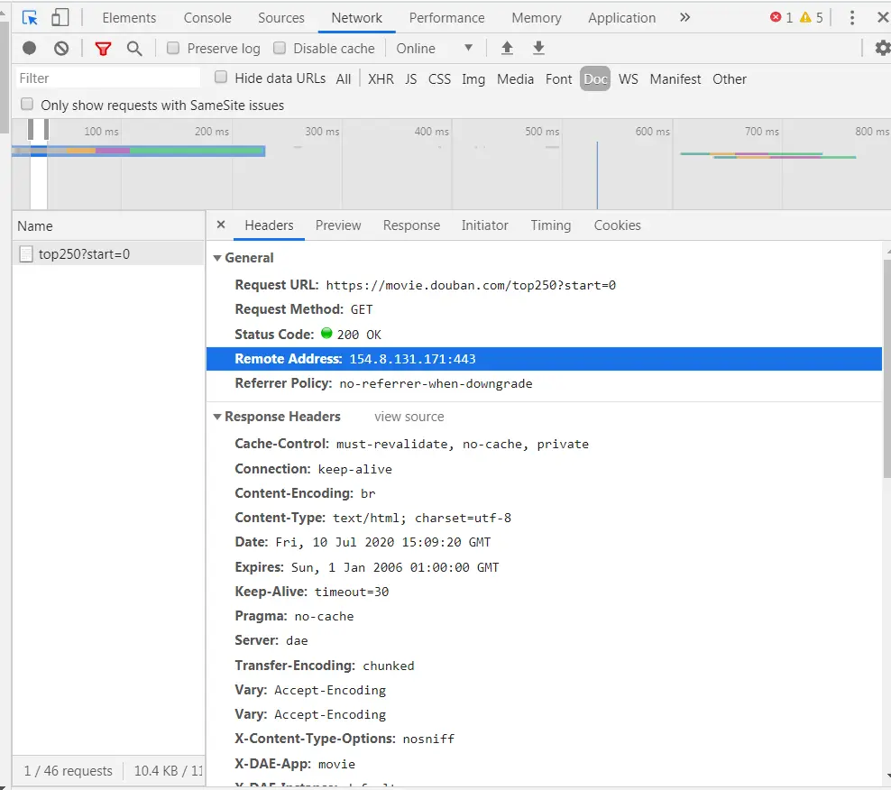 在Name栏的右侧你可以发现Headers一栏,这里就是我们使用Chrome浏览器向网站的服务器发出请求的数据,换句话说,Headers就是我们访问豆瓣网站时,告诉豆瓣的服务器我们所需要的数据。