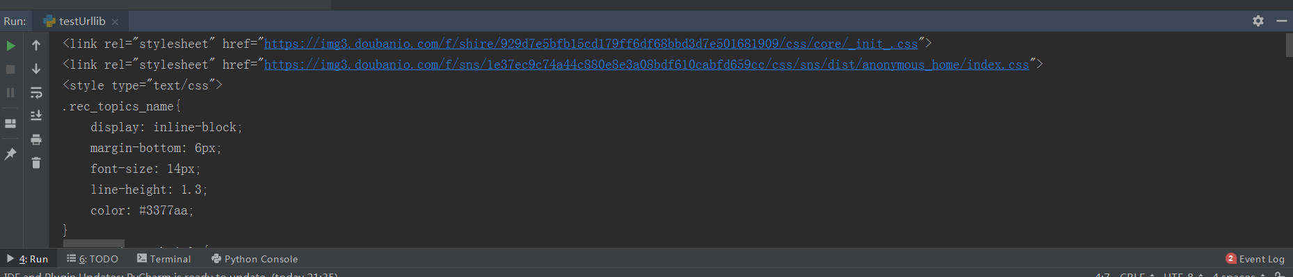 其实上面演示的就是一个最简单的爬虫了,但是不是所有网页我们都可以这么爬取的。因为很多网站设置了反爬虫,不想让我们去直接爬取他们的数据,比如我们把刚才代码中的网址换成豆瓣的电影栏目https://movie.douban.com,然后试试输出的结果。