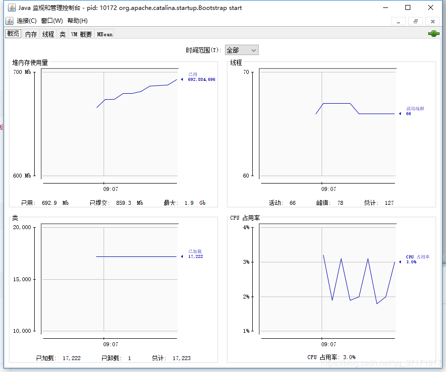 根据jdk自带的jconsole工具,可以监视到系统处于堵塞时期。cup占满,活动线程数持续增加,堆内存接近峰值。