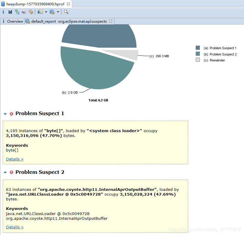 这里可以很清楚的看到堆内存的内容分布情况。当时系统是byte[]和InternalAprOutputBuffer占用内存最大,同为2.9G。