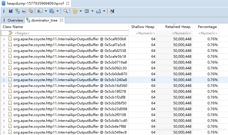 至少有一半都是InternalAprOutputBuffer对象。Shallow Heap 表示原本大小,Retained Heap表示在堆中占用内存的大小,单位bytes(1kb = 1024bytes),每个对象在堆中占约47.6兆空间,难以想象。