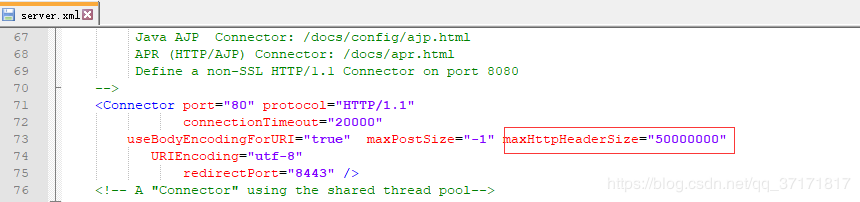 再结合org.apache.coyote.http11.InternalAprOutputBuffer类是Tomcat的一个类,猜想是不是跟Tomcat的配置有关,于是打开Tomcat的server.xml一探究竟。