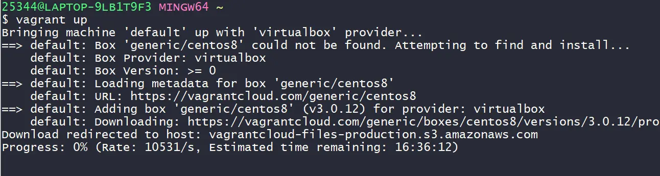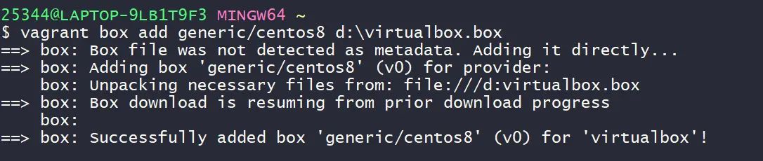 vagrant box add generic/centos8 d:\virtualbox.box然后运行vagrant up启动安装