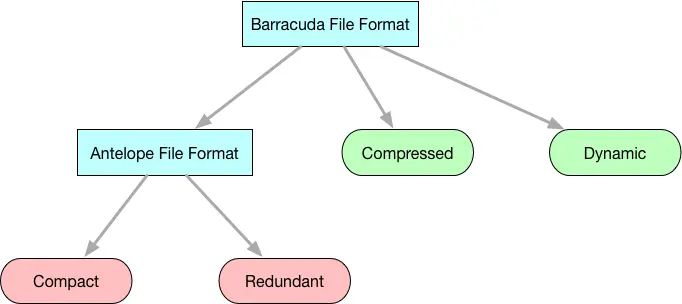 早期的文件格式(页格式)为Antelope,可以定义两种行记录格式,分别是Compact和Redundant Named File Format为了解决不同版本下页结构的兼容性,在Barracuda可以定义两种新的行记录格式Compressed和Dynamic- 变量为