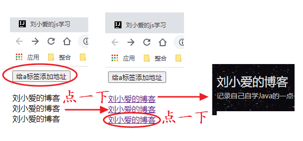 点一下按钮,触发点击上事件,a标签添加了一个超链接,颜色从黑变成了紫,