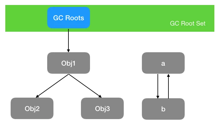 如图示,如果用可达性算法即可解决上述循环引用的问题,因为从GC Root 出发没有到达 a,b,所以 a,b 可回收